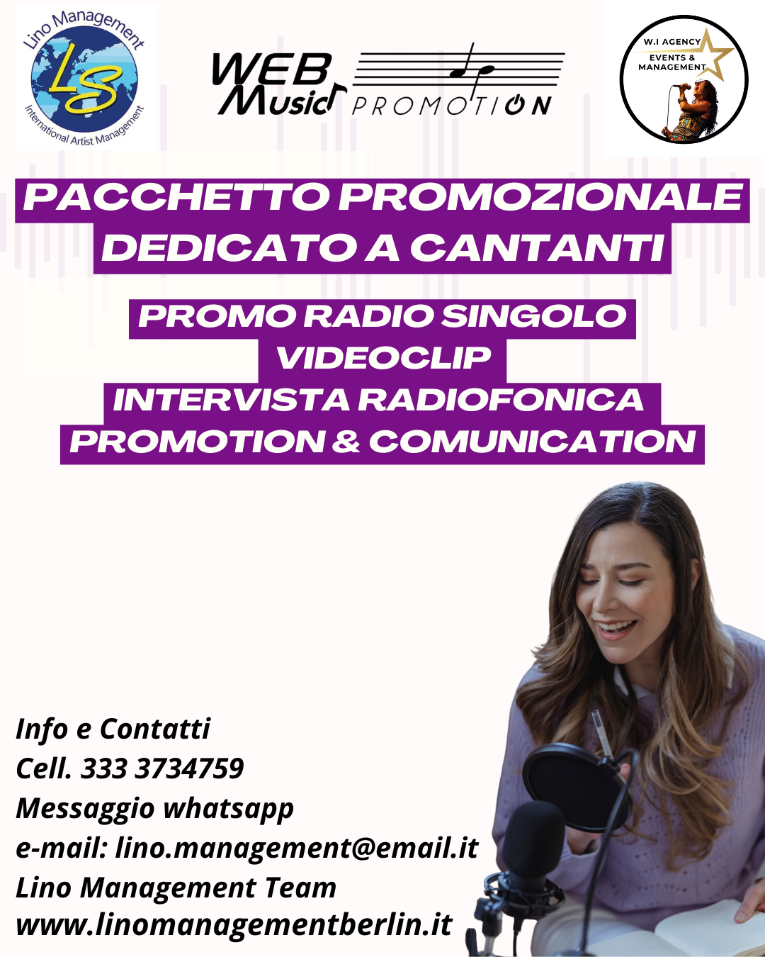 Aderisci alla cartolina digitale, un nuovo servizio Lino Management Berlin, il tuo singolo reggiungerà le emittenti radiofoniche nazionali ed internazionali in partnership con i professionisti del settore discografico, un servizio certificato e monitorato offerto in partnership commerciale con WI Agency. Per maggiori informazioni clicca il tasto in basso.