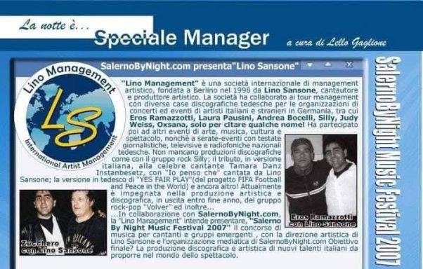 In breve…Lino Sansone è un manager e promotore musicale di calibro internazionale, con base operativa tra Berlino e l’Italia, grazie a una solida rete creata con agenti discografici, artisti affermati e format